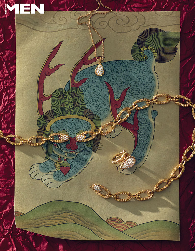 위부터 _ 지혜・용기・사랑・보호를 뜻하는 뱀의 상징성에서 착안해 뱀 머리를 나타내는 물방울 모티브에 다이아몬드를 허니콤 구조로 세팅한 옐로 골드 쎄뻥 보헴 미디엄 모티브 펜던트, 뱀 비늘을 재현한 옐로 골드 쎄뻥 보헴 빈티지 링크 브레이슬릿과 쎄뻥 보헴 링크 스몰 네크리스, 손가락을 휘감는 형상의 옐로 골드 원 헤드 라지 링 모두 Boucheron.