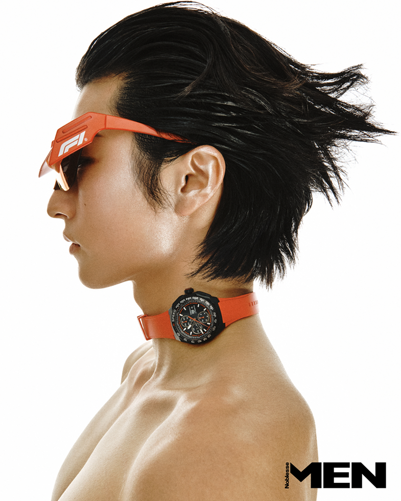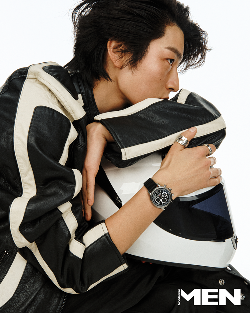 Tissot 모터사이클 레이싱에서 영감받은 T-레이스 컬렉션. 브레이크 디스크를 연상시키는 베젤과 계기반에서 착안한 크로노그래프 디테일로 레이싱의 역동적 감각을 시계에 담았다. 지름 45mm의 스테인리스스틸 케이스에 쿼츠 크로노그래프 무브먼트를 탑재한 T-레이스 쿼츠 크로노그래프. 블루종과 팬츠 모두 Sacai, 카무플라주 팬츠 Levi’s,