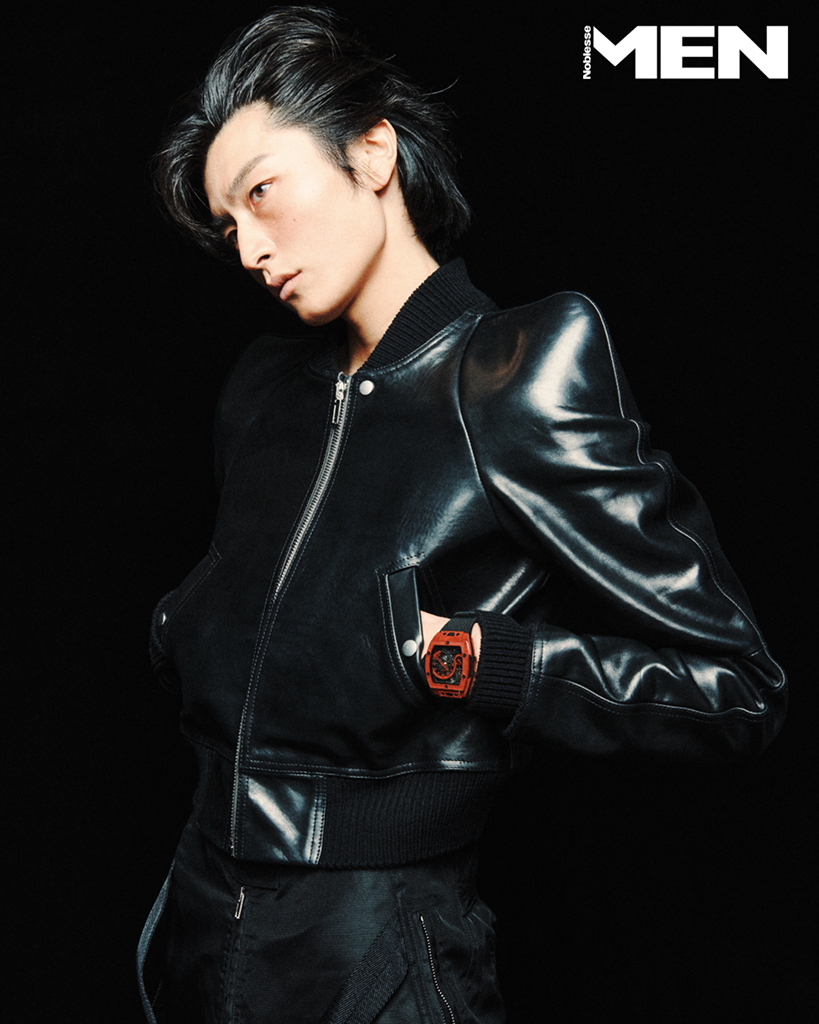 레더 재킷 Diesel, 검지와 엄지에 착용한 반지 모두 Louis Vuitton.