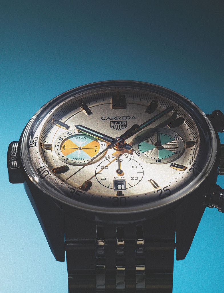 까레라 크로노그래프 글라스박스 시페어러는 최초의 시페어러가 품은 항해의 서사를 현대적으로 재해석 했다. 지름 42mm의 스테인리스스틸 케이스 9시 방향에 자리한 디스플레이는 만조와 간조 구간을 색으로 구분하고, TIDE 버튼으로 조수 디스크를 간편하게 설정할 수 있다. TAG Heuer.