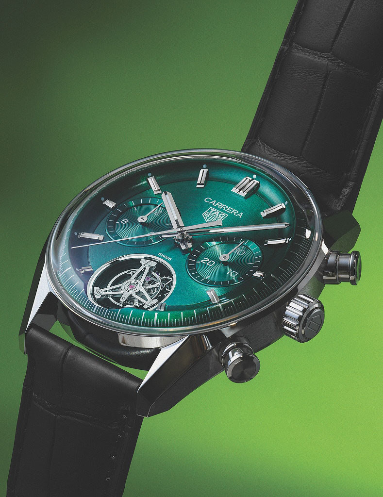 까레라 크로노그래프 투르비용은 브러시드 마감한 그린 다이얼이 세련된 인상을 전한다. 6시 방향의 오픈워크 투르비용은 무브먼트 TH20-09에 의해 안정적으로 구동하며, 회전하는 투르비용의 움직임은 생동감과 함께 시각적 즐거움을 더한다. TAG Heuer.