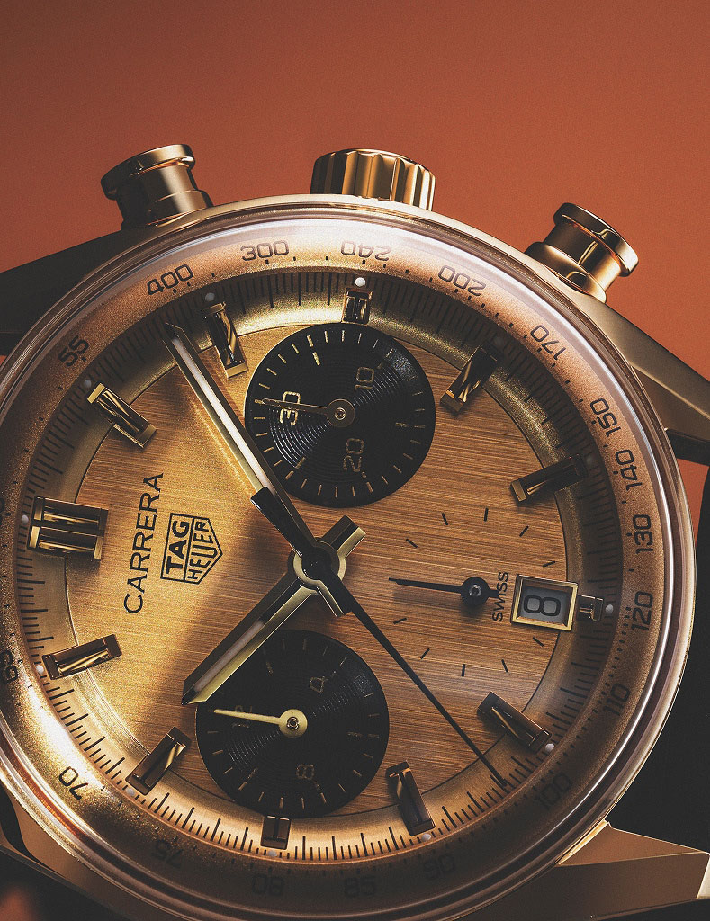 오리지널 까레라 모델은 18K 3N 옐로 골드 도금의 지름 39mm 케이스와 다이얼, 블랙 스네일 마감 처리한 판다 레이아웃, ‘SUCCESS’ 문구를 새긴 백케이스를 갖췄다. 까레라 크로노그래프 석세스는 원형의 디자인 코드를 충실히 계승한다. 3시와 9시 방향의 크로노그래프 서브 카운터와 타키미터 스케일은 속도 측정을 위한 기능적 구성으로 레이싱 시계의 정체성을 강조한다. TAG Heuer.