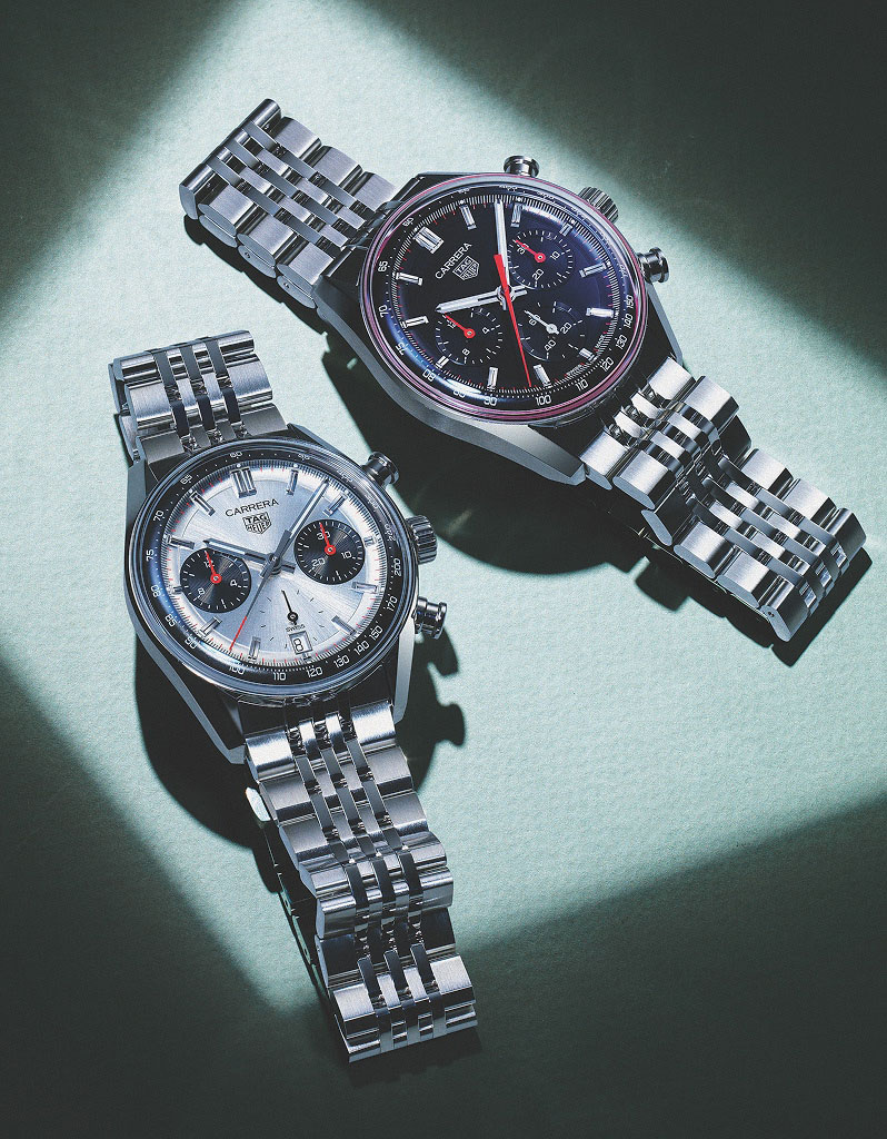 1960년대 까레라 컬렉션으로 선보인 호이어 7753 SN의 ‘판다’ 디자인을 기념한 까레라 크로노그래프 글라스박스 판다. 2개의 서브 다이얼을 매치한 상징적 레이아웃에 타키미터를 이너 베젤로 옮기고, 전체를 돔형 글라스로 덮어 입체적 디자인을 완성했다. 블랙 다이얼의 까레라 크로노그래프 글라스박스는 크로노그래프 핸즈와 다이얼 테두리에 레드 포인트를 더해 시인성을 높였다. 지름 41mm의 케이스에는 TH20-01을 탑재해 80시간의 파워리저브를 지원한다. 두 시계는 모두 빈티지 비즈 오브 라이스 스타일을 현대적으로 재해석한 7열 브레이슬릿을 적용해 착용감이 편안하다. TAG Heuer.