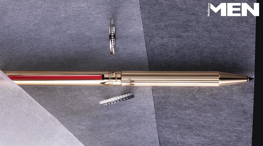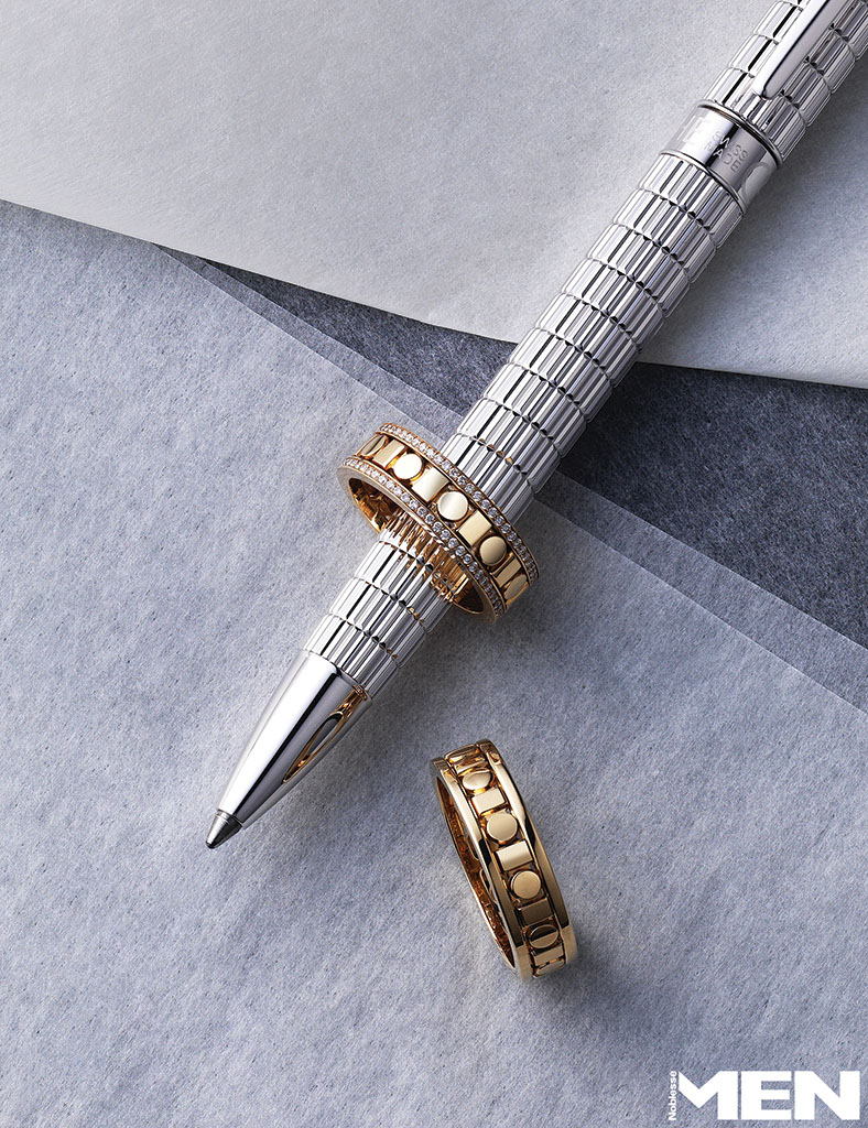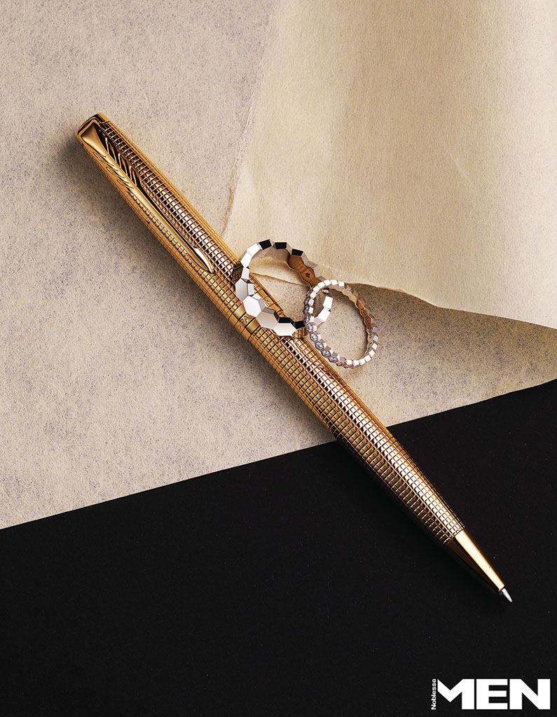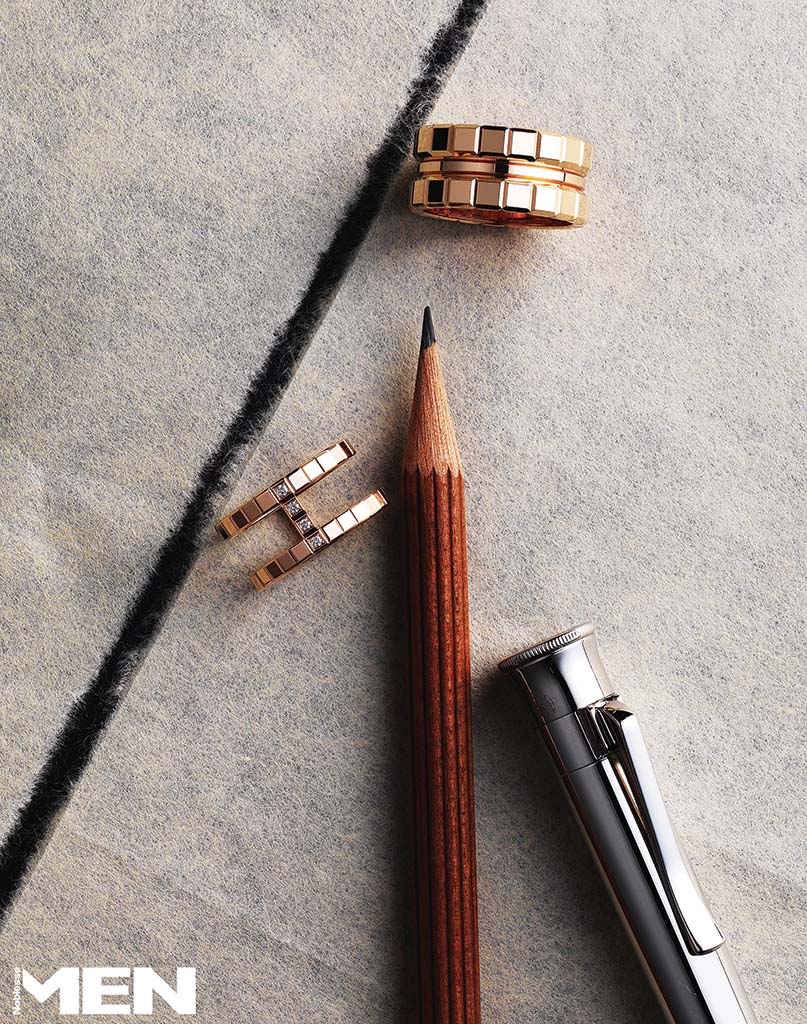 밴드 2개를 겹친 듯한 로즈 골드 아이스 큐브 링, 반지 2개를 연결한 듯한 구조적 디자인이 돋보이는 로즈 골드 아이스 큐브 링 모두 Chopard, 캡에 연필깎이가 내장된 그라폰 퍼펙트 펜슬 Graf Von Faber-Castell.