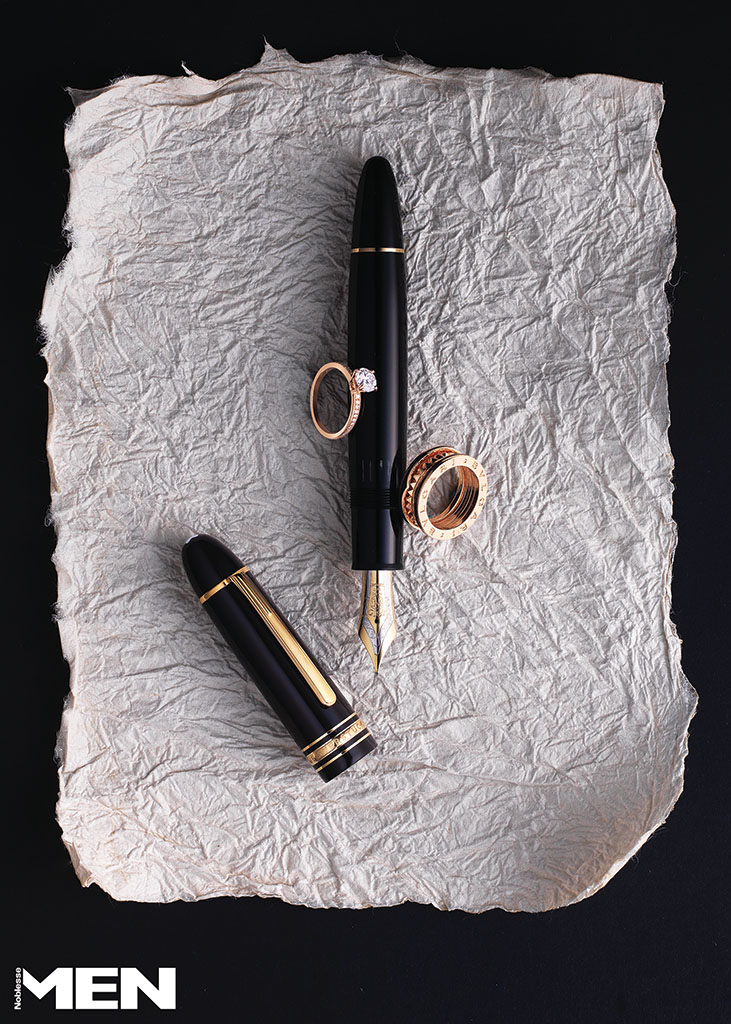 중앙의 브릴리언트 컷 다이아몬드가 찬연한 빛을 내는 로즈 골드 로마 아모르 링, 로즈 골드 스터드와 나선형 블랙 세라믹 라인이 인상적인 비제로원 링 모두 Bvlgari, 블랙 레진과 골드의 대비, 수공으로 새긴 닙으로 고급스러운 면을 강조한 마이스터스튁 골드 코팅 149 만년필 Montblanc. 공예 재료로도 활용하는 주름지 장지방.