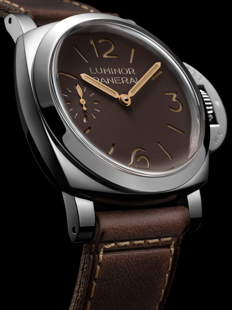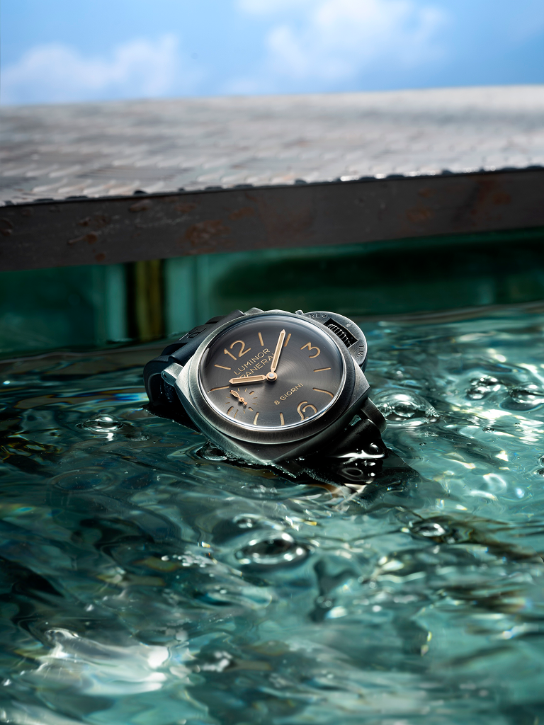 빈티지스러운 다이얼은 스타일보다는 기능에서 탄생한 디자인 규칙의 보존입니다.  루미노르 44mm PAM01731의 타바코 다이얼은 매트한 질감과 베이지 컬러 슈퍼-루미노바(Super-LumiNova) 인덱스를 통해 기능적이고 헤리티지 중심의 감성을 표현합니다. 루미노르 8 지오르니 44mm PAM01733의 안트라사이트 다이얼은 원형 브러싱과 브루니토 마감이 어우러져 ‘현장에서 쓰인 도구’라는 질감을 강조하고요. 두 다이얼 모두 역사적 계측 기기와 시각적으로 연결되며, 그 톤과 표면 처리 방식 자체가 브랜드의 기억을 담습니다.