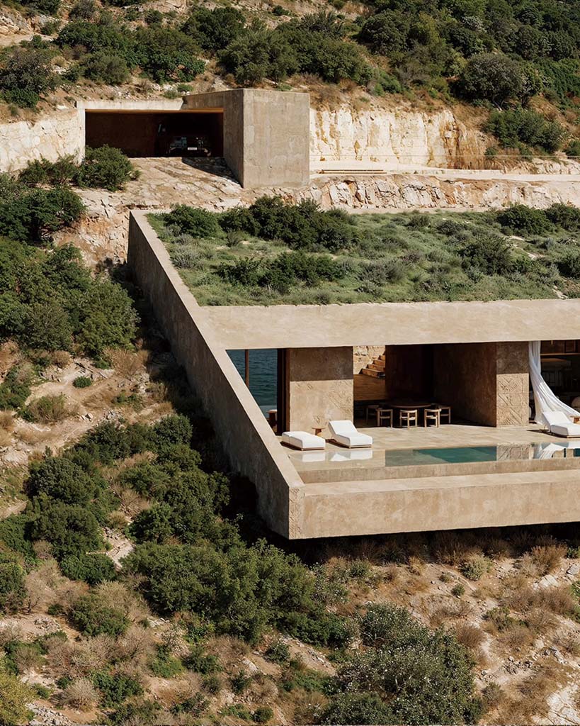 리조트는 가파른 절벽 경사를 따라 ‘지그재그’ 형태로 배치된다. 각 유닛이 다른 유닛의 시야를 가리지 않아 모든 투숙객이 탁 트인 전망을 누릴 수 있다. 직선으로 뻗은 테라스와 수영장은 바다와 산세를 한 화면에 담으며 건축과 자연을 유려하게 이어주며, 인피니티 풀은 해안선과 시각적으로 맞물려 바다와 이어지는 듯한 착각을 일으킨다. 동선은 직관적이고 간결하다. 테라스, 정원, 수영장을 오가는 수직 이동은 끊김 없는 보행로와 경사형 케이블카(푸니쿨라)가 맡아, 지형 훼손없이 층간 접근성을 높인다. 외벽은 현지에서 조달한 베라트 석재로 마감했는데, 내구성이 강한 이 돌은 자연스레 변색·풍화되어 시간이 흐를수록 건물과 땅이 조화롭게 어우러지는 풍경을 만든다.