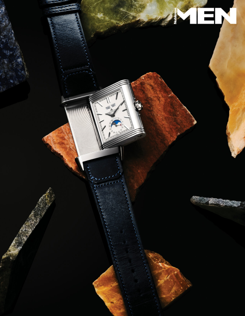 회전식 케이스라는 발상은 손목시계의 외형과 기능을 동시에 바꿔놓은 혁신이었다. 리베르소 트리뷰트 듀오페이스 캘린더는 이 전설적 구조를 유지한 채 앞면에 요일과 날짜, 월과 문페이즈를 갖춘 트리플 캘린더를, 뒷면에는 세컨드 타임 존과 낮·밤 표시를 배치했다.
