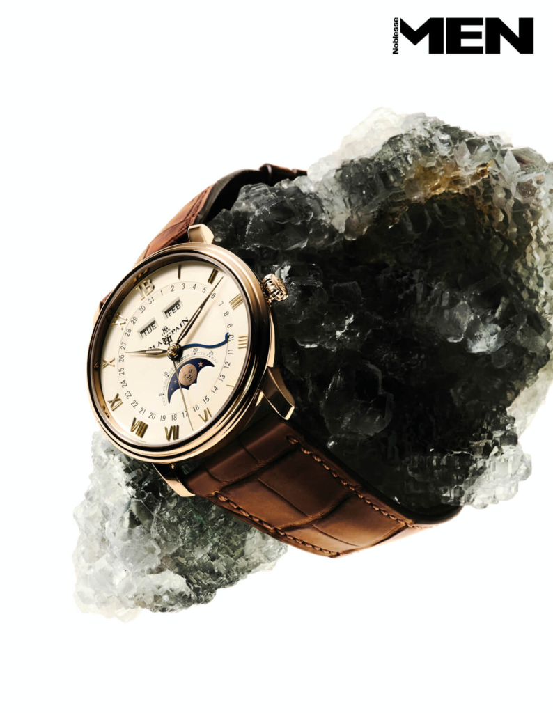 블랑팡 문페이즈는 전통을 드러내는 얼굴이다. 지름 40.20mm 레드 골드 케이스 안에 자동 칼리버를 탑재해 약 72시간의 파워리저브를 제공하고 실리콘 밸런스 스프링으로 안정성을 높였다. 클래식한 로마숫자 인덱스와 중앙 날짜 핸즈, 의인화된 달이 어우러지며 기능과 감성이 균형을 이룬다. 그린 플루라이트 힐링 크리스털 Ondo.