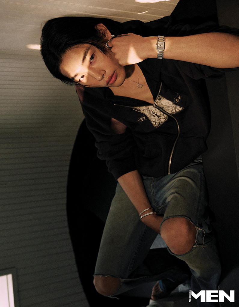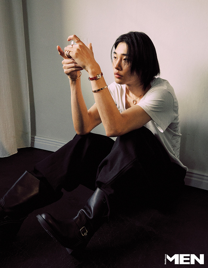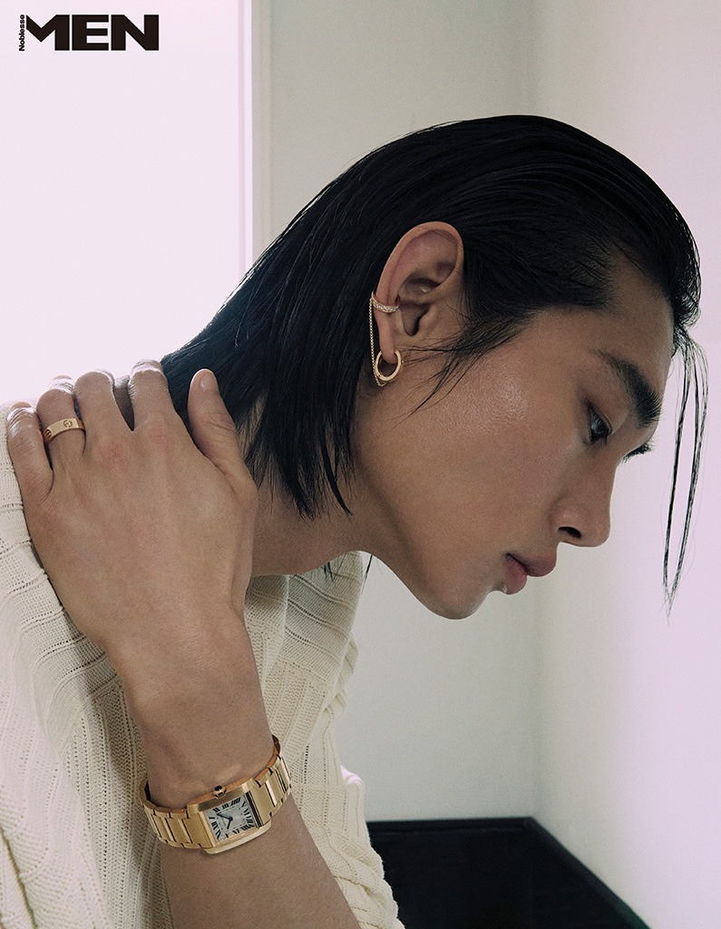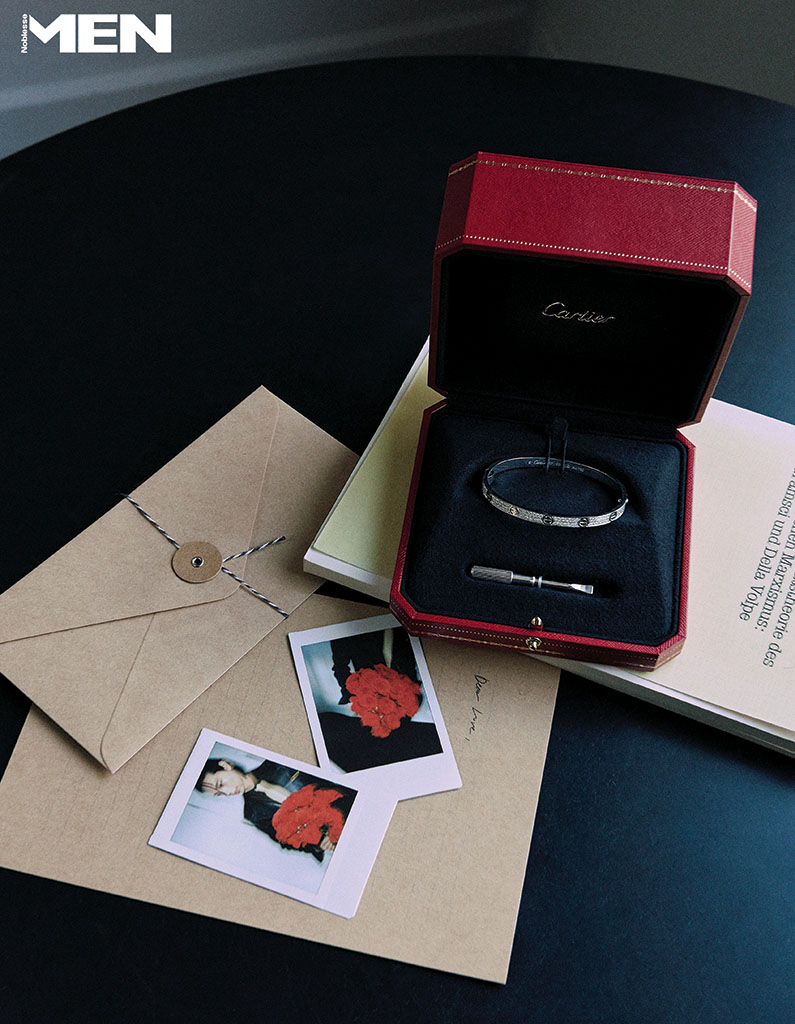 화이트 골드에 다이아몬드를 파베 세팅한 LOVE 이어링과 브릴리언트 컷 다이아몬드를 장식한 화이트 골드 저스트 앵 끌루 네크리스, 왼쪽 손목에 착용한 탱크 프랑세즈 워치, 왼손 검지에 착용한 화이트 골드와 블랙 세라믹을 조합한 트리니티 링 클래식 모델, 오른쪽 손목에 착용한 화이트 골드 LOVE 언리미티드 브레이슬릿, 화이트 골드에 4개의 브릴리언트 컷 다이아몬드를 장식한 LOVE 브레이슬릿 모두 Cartier.