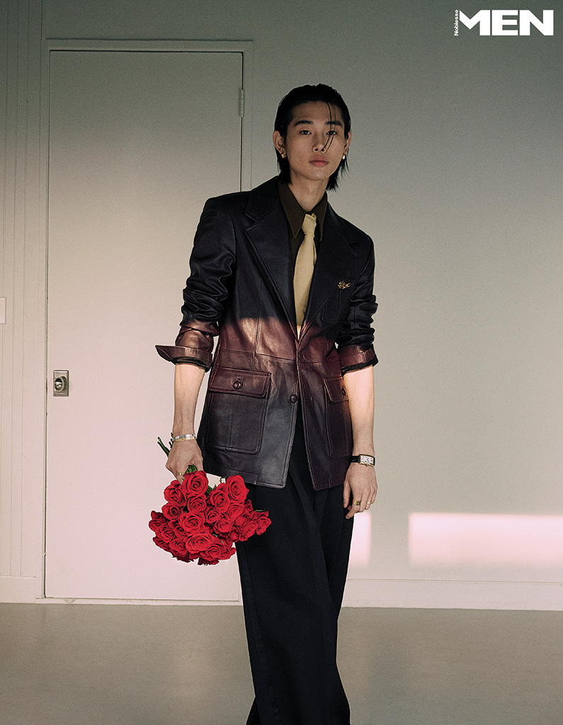 보라색 레더 재킷과 브라운 셔츠, 옐로 타이 모두 Amiri, 블랙 울 팬츠 Dolce&Gabbana.
