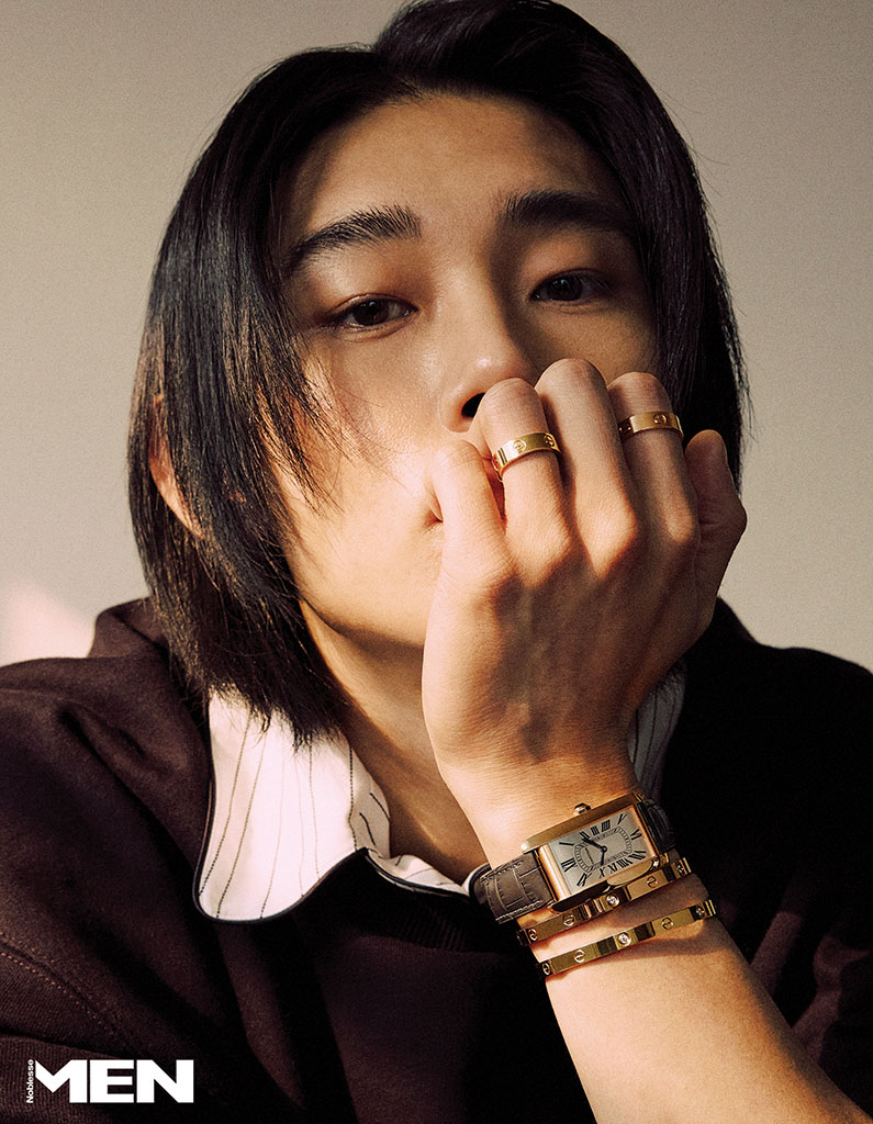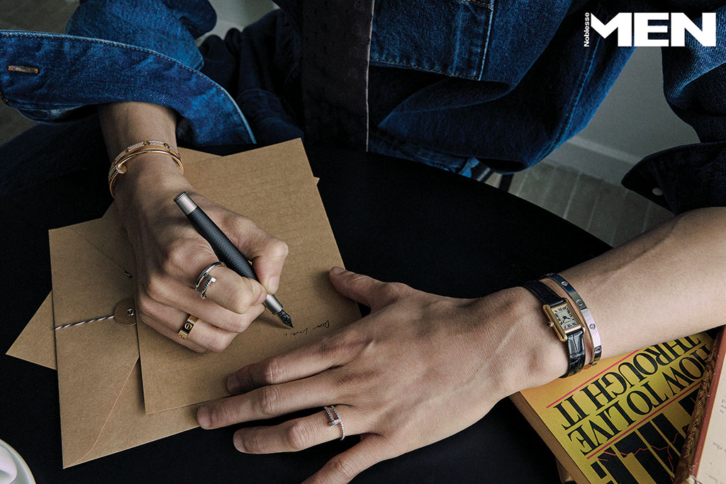 오른쪽 손목에 착용한 옐로 골드에 브릴리언트 컷 다이아몬드를 파베 세팅한 LOVE 브레이슬릿 미디엄 모델과 다이아몬드를 장식한 옐로 골드 저스트 앵 끌루 브레이슬릿 스몰 모델, 오른손 검지에 착용한 화이트 골드 저스트 앵 끌루 링 클래식 모델, 약지에 착용한 옐로 골드 LOVE 링 클래식 모델, 왼쪽 손목에 착용한 화이트 골드에 4개의 브릴리언트 컷 다이아몬드를 조합한 LOVE 브레이슬릿 미디엄 모델, 옐로 골드 케이스와 샤이니 블랙 앨리게이터 가죽 스트랩의 조합이 돋보이는 탱크 루이 까르띠에 워치, 왼손 약지에 착용한 화이트 골드에 브릴리언트 컷 세미 파베 세팅한 저스트 앵 끌루 링 스몰 모델 모두 Cartier.