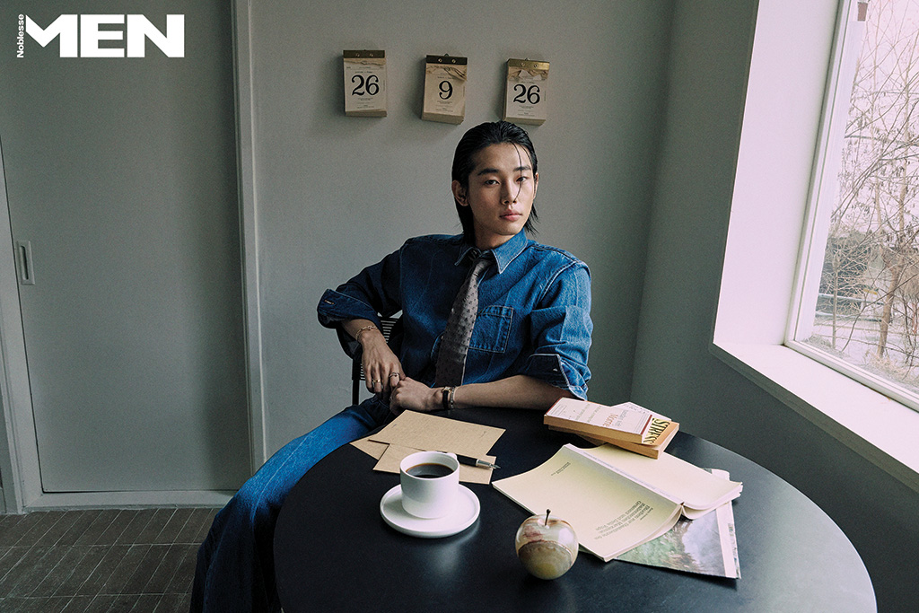 데님 셔츠와 팬츠 모두 Ferragamo, 지오메트릭 패턴 타이 Berluti.