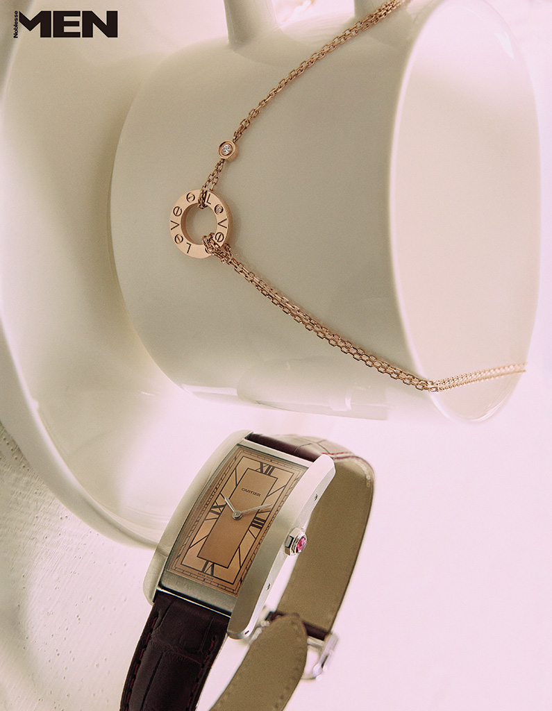 핑크 골드에 2개의 브릴리언트 컷 다이아몬드를 세팅한 LOVE 네크리스와 아르데코 애니메이션을 장식한 샐먼 컬러 다이얼이 돋보이는 탱크 아메리칸 워치 모두 Cartier.